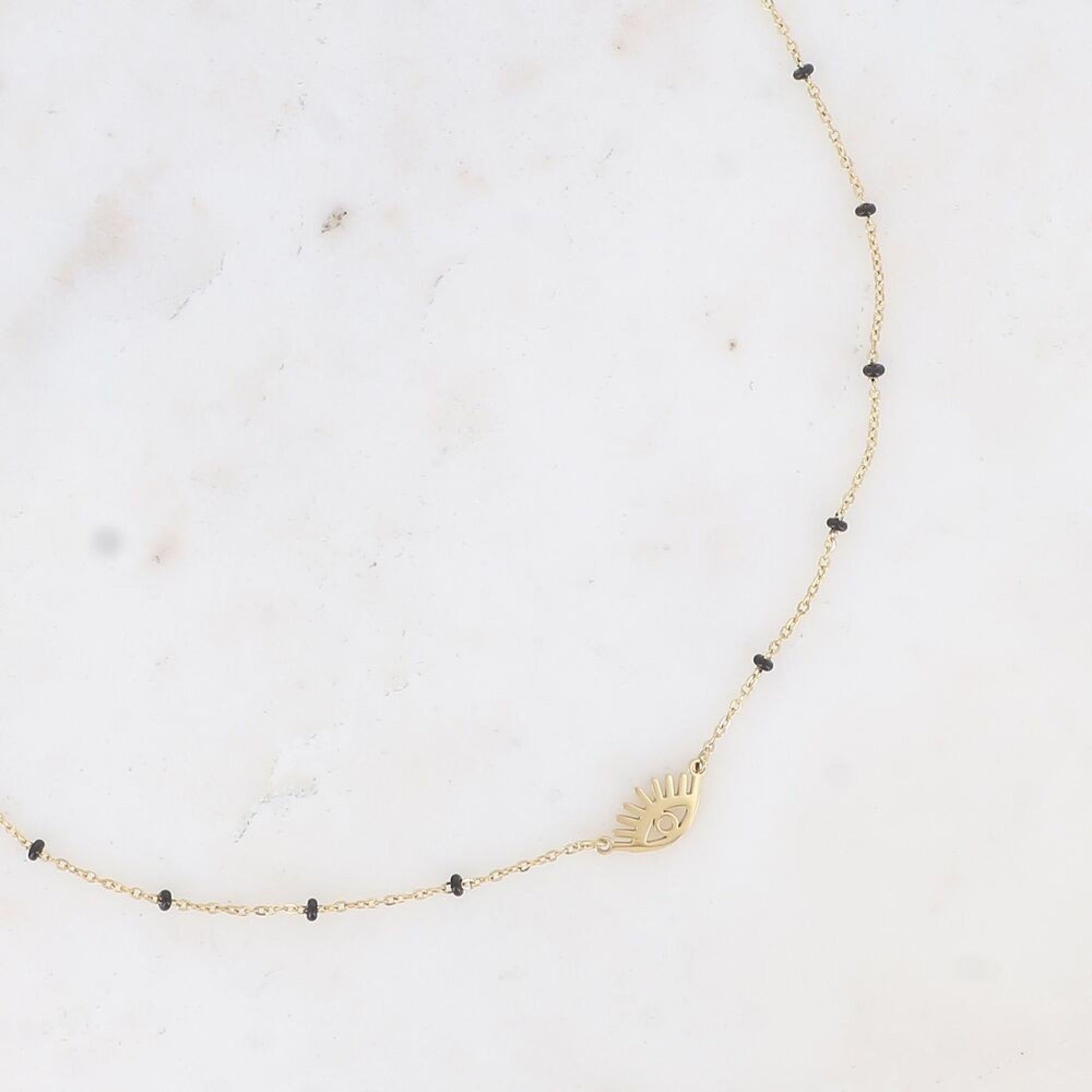 Ce collier est en acier inoxydable avec des touches en émail noir et un pendentif "oeil" ajouré !