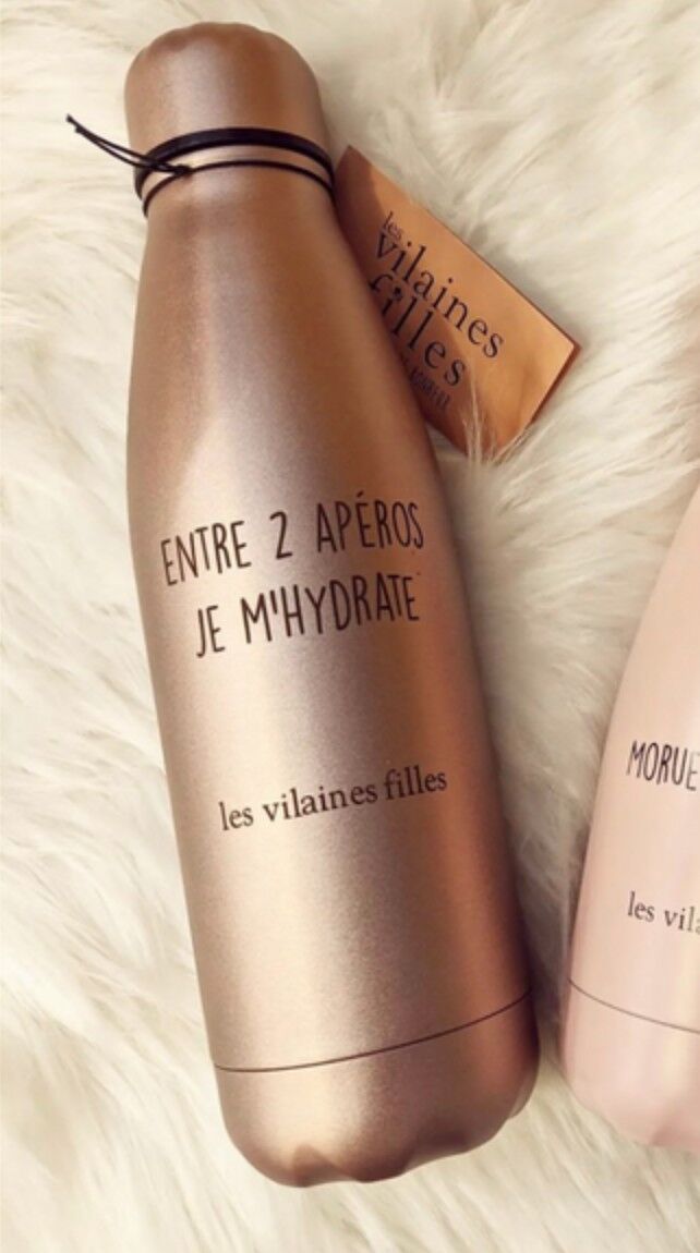 Une gourde couleur "or rose" à message de la marque Les Vilaines Filles "Entre deux apéros je m'hydrate", de quoi faire plaisir à vos copines fan d'apéro !