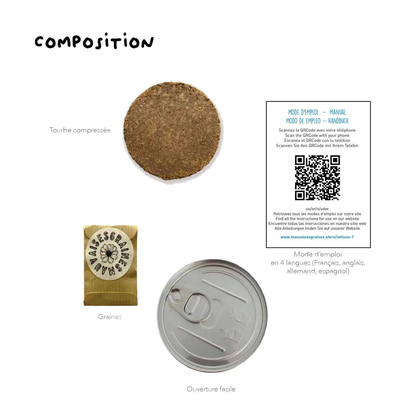 Ce kit comprend de la terre, des graines de fleurs sauvages, à faire pousser soi-même.