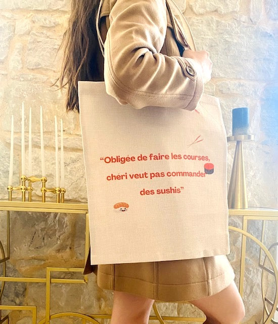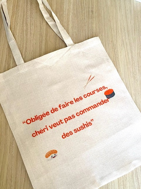 On peut les commande nous-même mais c'est pas pareil...utilisez votre tote bag pour faire des courses et mettre la pression à votre chéri ! #Onveutdessushis
